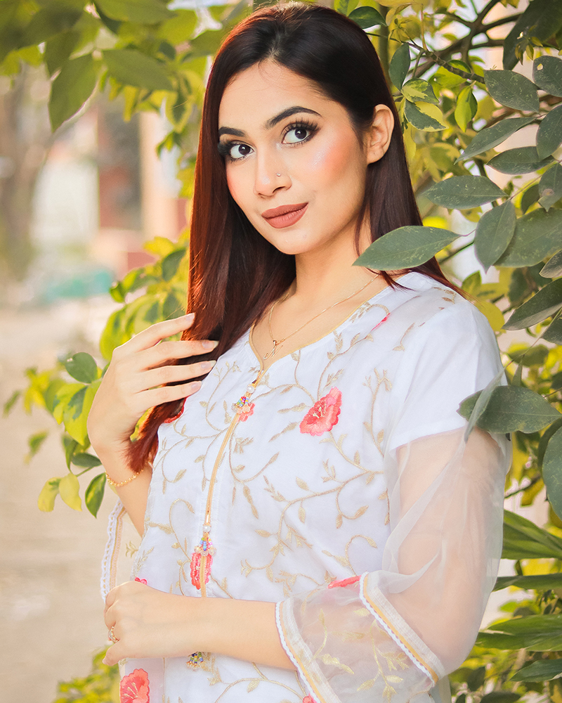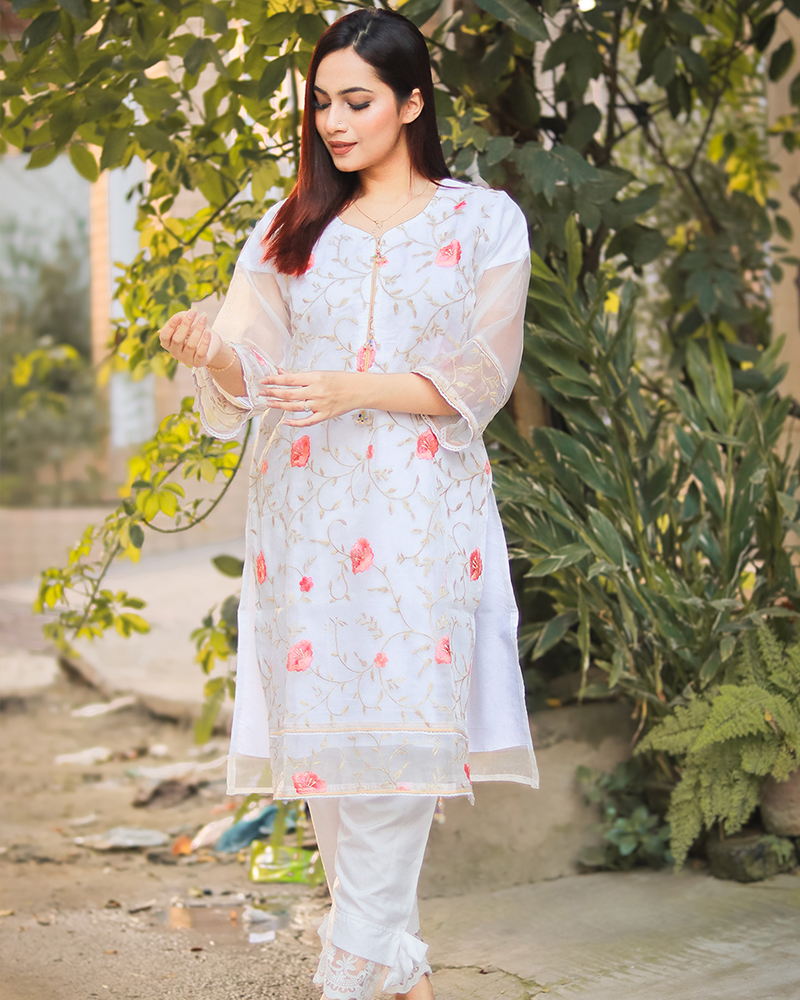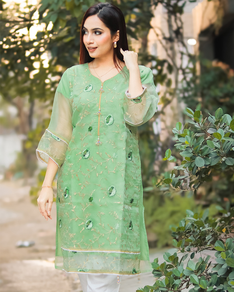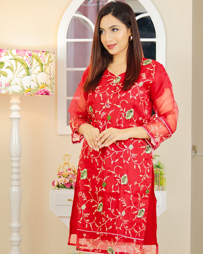 Crafted from premium Oranza fabric, this kurti is not only elegant but also incredibly comfortable to wear. The fabric is breathable and soft against the skin, making it perfect for all-day wear, even during the warmer months. The kurti is lightweight and easy to care for, ensuring that it retains its beauty and durability even after multiple washes.