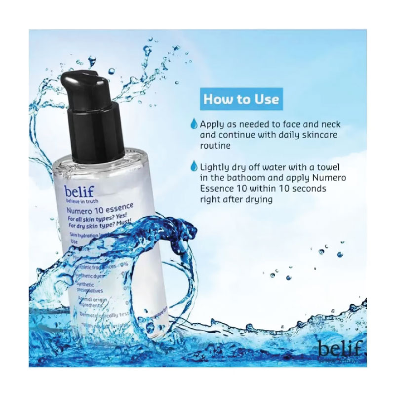 How to Use: Apply a few drops of Belif Numero 10 Essence onto your clean, dry face and gently pat it in until fully absorbed. Use morning and evening for best results. Follow with your favorite moisturizer to lock in the benefits.