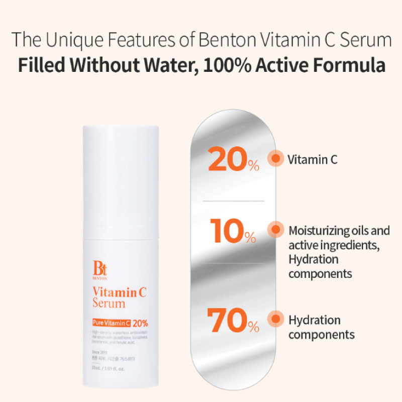 Benton is a leading Korean skincare brand known for its use of natural and safe ingredients to create effective skincare products. The Benton Vitamin C Serum is formulated to provide maximum results with minimal irritation, making it the perfect choice for those looking to enhance their skincare routine with a powerful yet gentle serum.