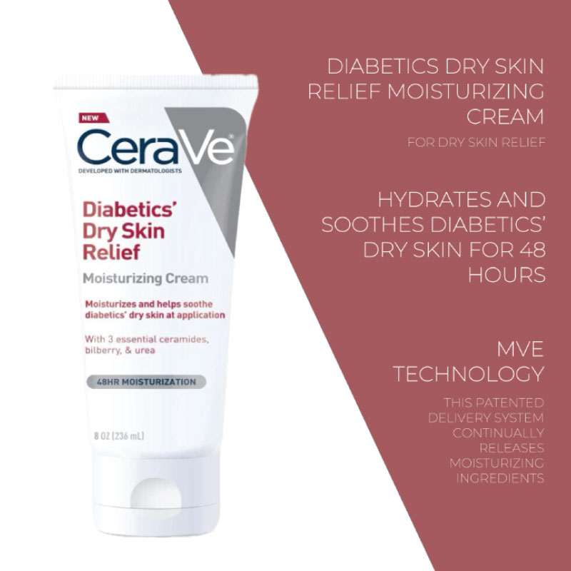 How to Use: Apply CeraVe Diabetics Dry Skin Relief Moisturizing Cream generously to dry, rough areas as needed. For best results, use after bathing, when skin is still damp, to lock in moisture. It’s suitable for daily use on the body and hands.