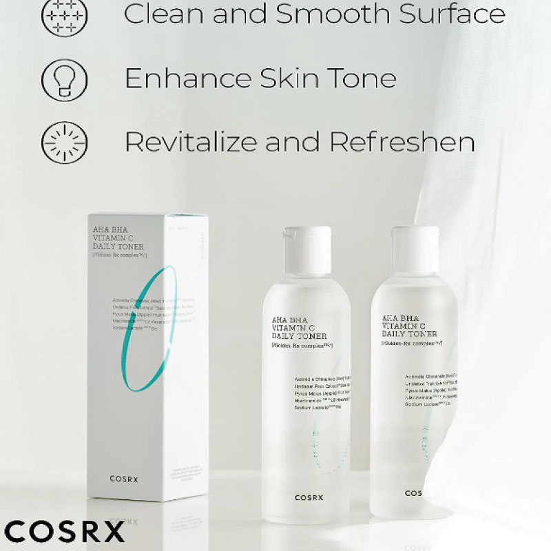 COSRX Refresh AHA BHA Vitamin C Daily Toner is an exfoliating daily toner that effectively eliminates flakes and dead skin cells while keeping pores clear. Infused with natural clarifying acids, this treatment toner controls excess oil and sebum while hydrating depleted skin. Best for all skin types, especially dull, and dry skin prone to pore congestion. AHA, BHA, and Vitamin C work together to reveal soft and bright skin.
