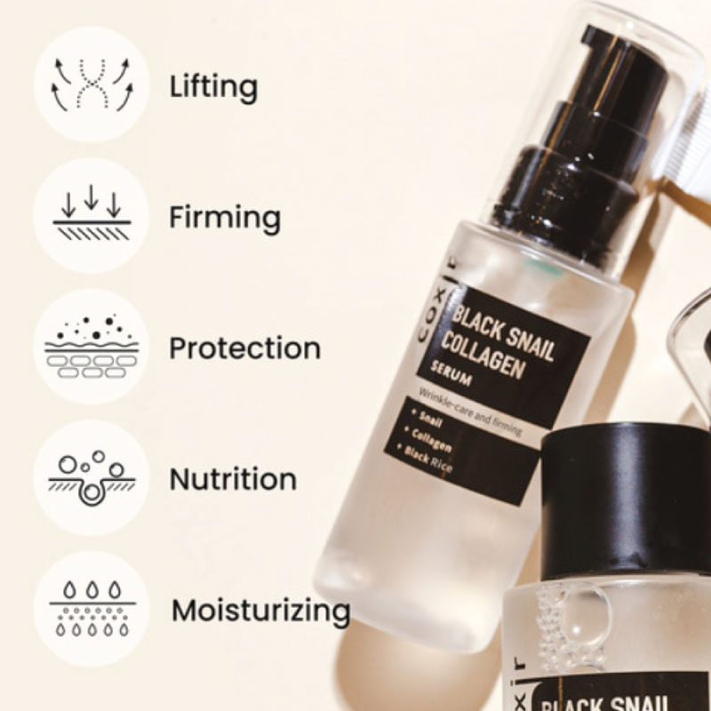 - Hydrating Complex: With a blend of hydrating agents, the COXIR Black Snail Collagen Serum provides intense moisture, ensuring your skin remains supple and well-nourished throughout the day. It helps balance skin hydration levels, making it ideal for both dry and combination skin types.