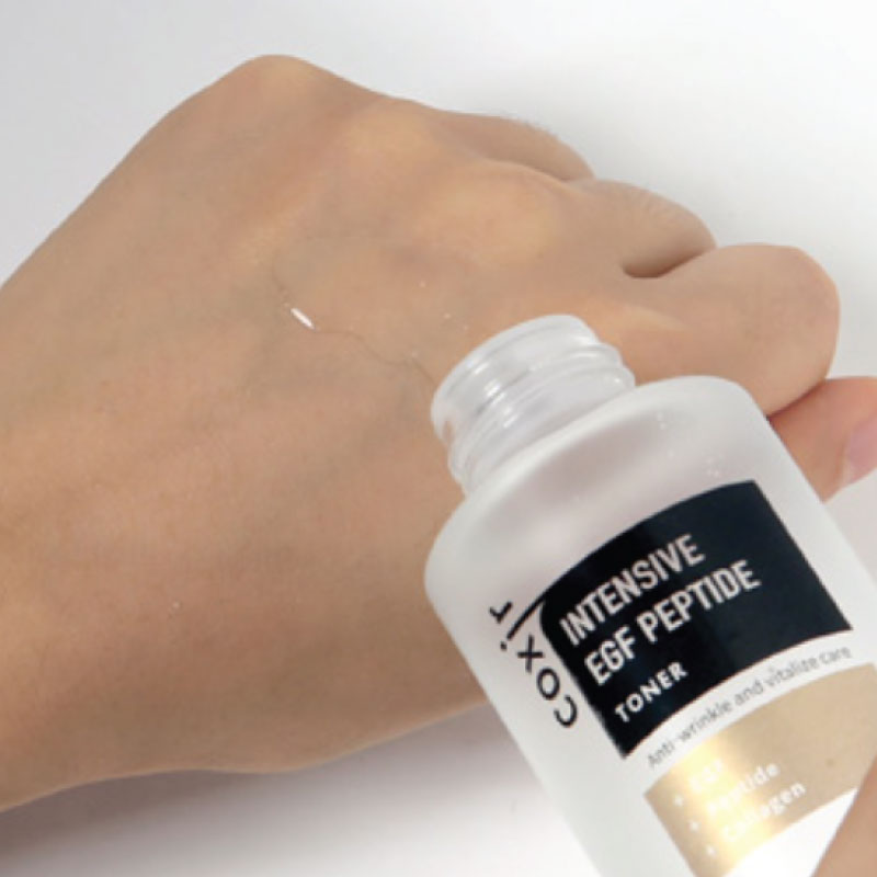 Intensive EGF Peptide Toner is certified for its anti-wrinkle function from the Korea Food and Drug Administration. It contains EGF, Peptide and Collagen. Collagen which is one of the 3 ingredients composing skin that elaborates tight skin and Adenosine which has the anti-wrinkle effect that makes your skin elastic and sleek. It also cares the 5 kinds of phenomena of aging which are wrinkles, elasticity lowering, fall of skin density, decline of brightness and drooped pores to elaborate young and healthy skin. This highly concentrated anti-aging and high-nutrient toner is for the daily elasticity care to have a vital skin.