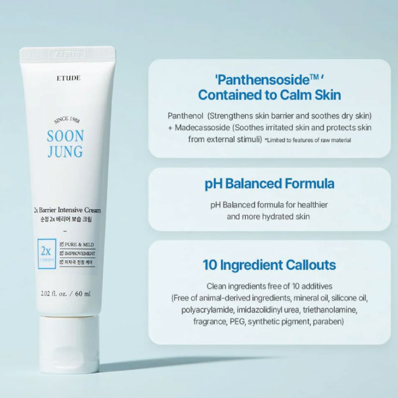 Etude House SoonJung 2x Barrier Intensive Cream uses 93% naturally derived ingredients and minimal ingredients to balance, hydrate, and soothe skin with every use.