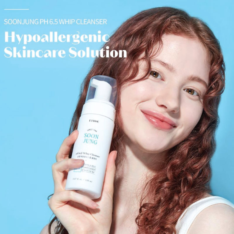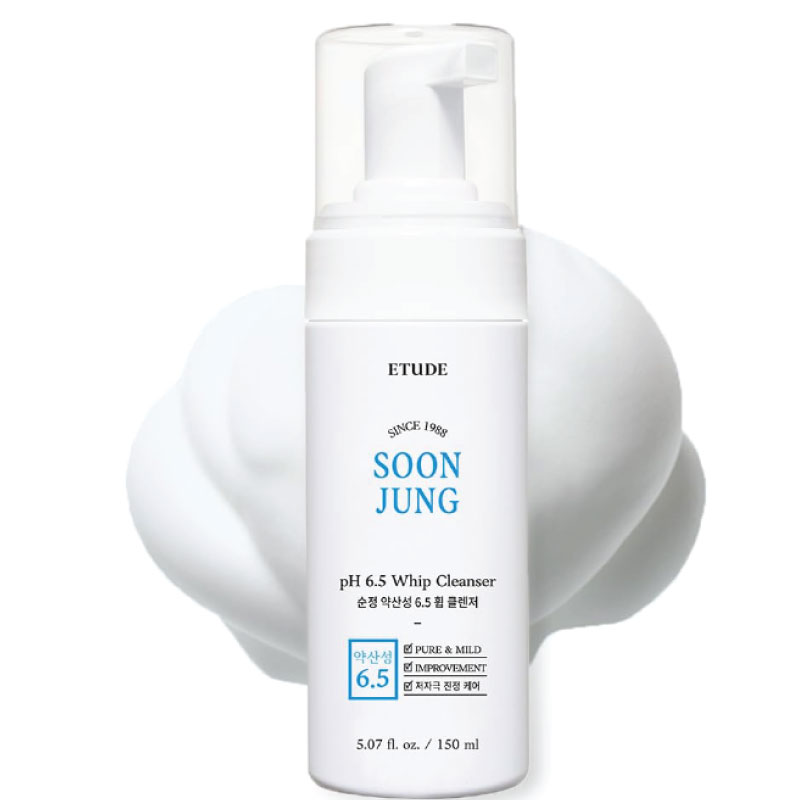 vThe Etude House Soon Jung pH 6.5 Whip Cleanser is a whipped creamy cleansing foam that keeps the skin moisturised and soothed while cleansing it. Formulated with 98% of naturally derived ingredients, this mild cleanser uses madecassoside and panthenol to deeply hydrate and repair damage.
