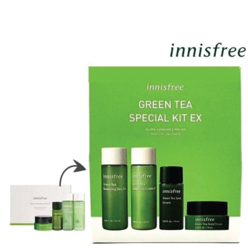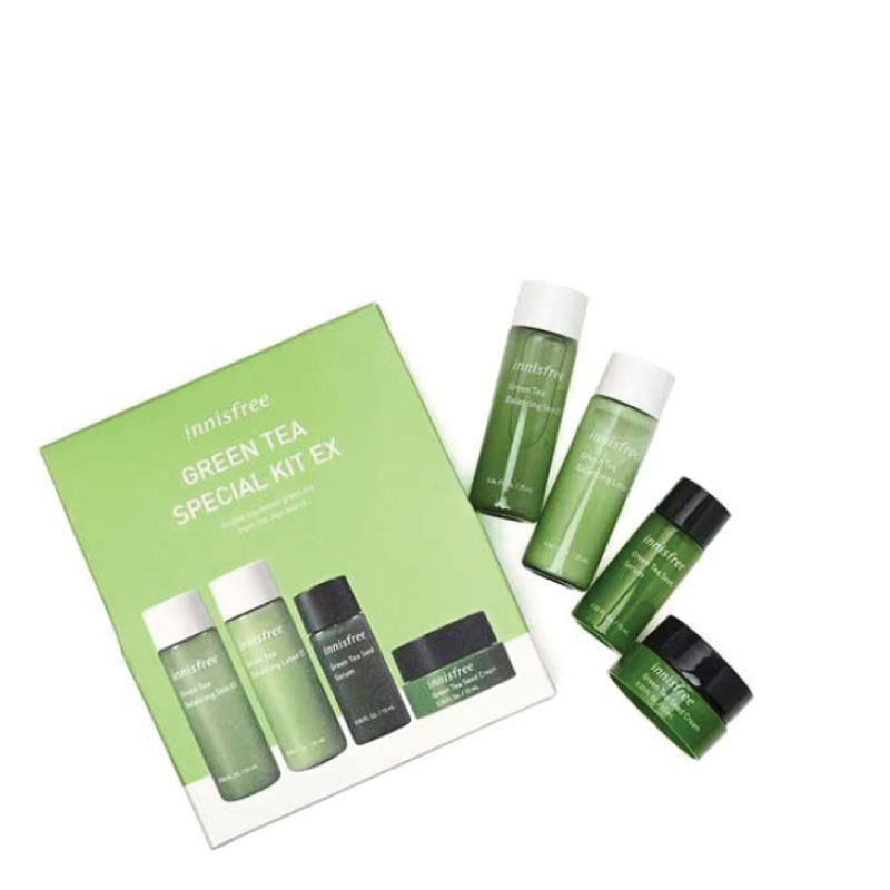 Revitalize your skin with the INNISFREE Green Tea Special Kit EX, featuring a cleansing foam, toner, essence, and moisture cream. Enriched with Jeju green tea, this kit deeply hydrates, soothes, and revitalizes your complexion, making it ideal for daily use. Achieve a radiant, healthy glow with this complete skincare solution.