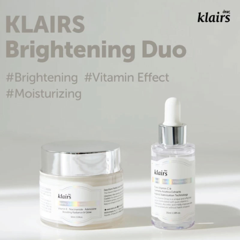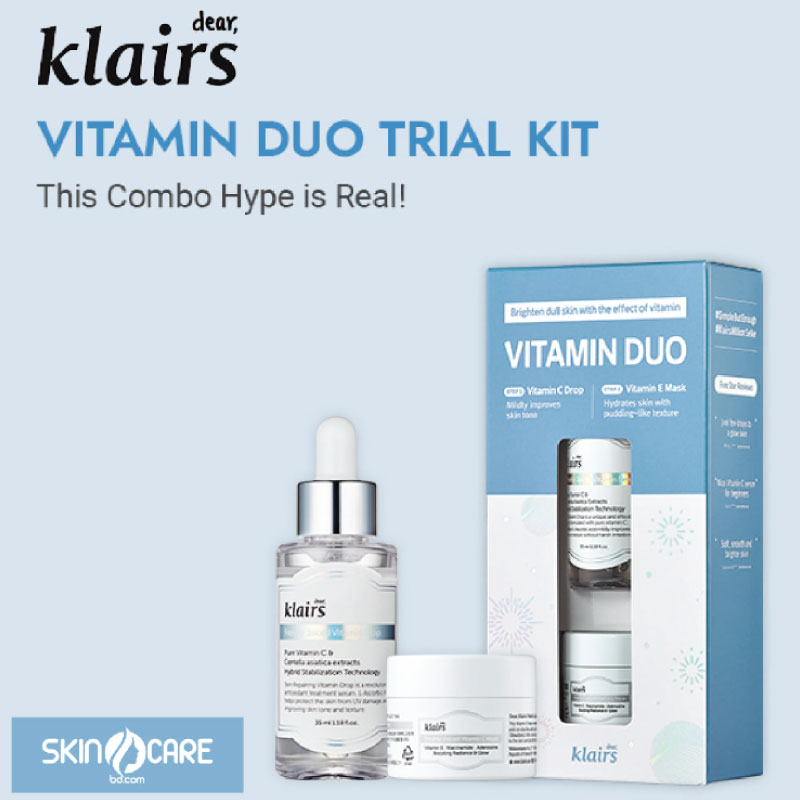 The Vitamin Duo Trial Kit includes the full-size Dear,Klairs Freshly Juiced Vitamin Drop and Freshly Juiced Vitamin E mask miniature. It is a mild and effective vitamin care routine so all skin types. The vitamin drop and vitamin mask both contain a generous amount of vitamin C and E that combine to be effective in brightening and plumping the skin. Especially recommended for brightening dull skin with the effect of vitamin.