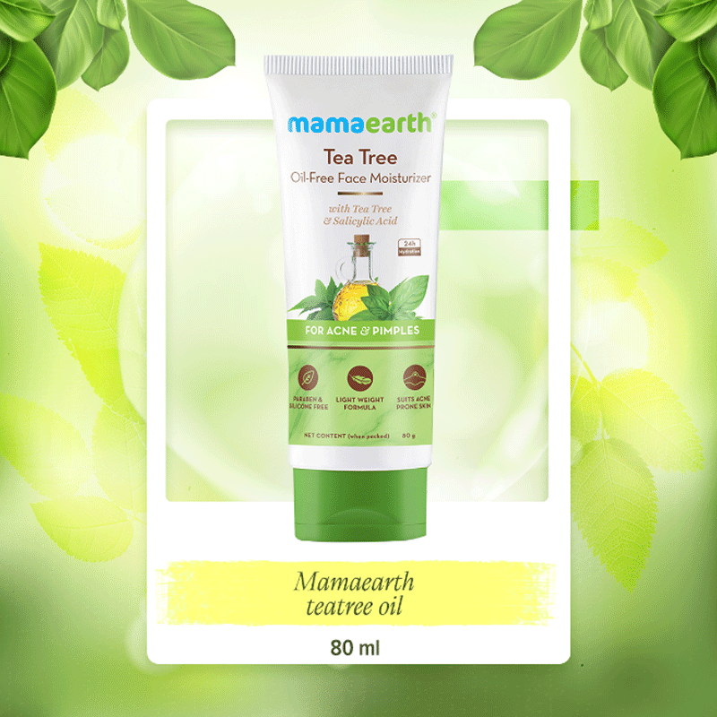 Product Overview: Mama Earth Tea Tree Oil-Free Moisturizer is crafted with Tea Tree Oil, Salicylic Acid, and Neem Extracts. Tea Tree Oil provides antibacterial properties to combat acne-causing bacteria, while Salicylic Acid gently exfoliates and unclogs pores. Neem Extracts soothe irritation and reduce redness, making it ideal for sensitive skin.